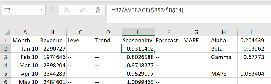 We Change the seasonality formula to this, and copy to the first 12 months.